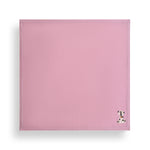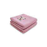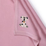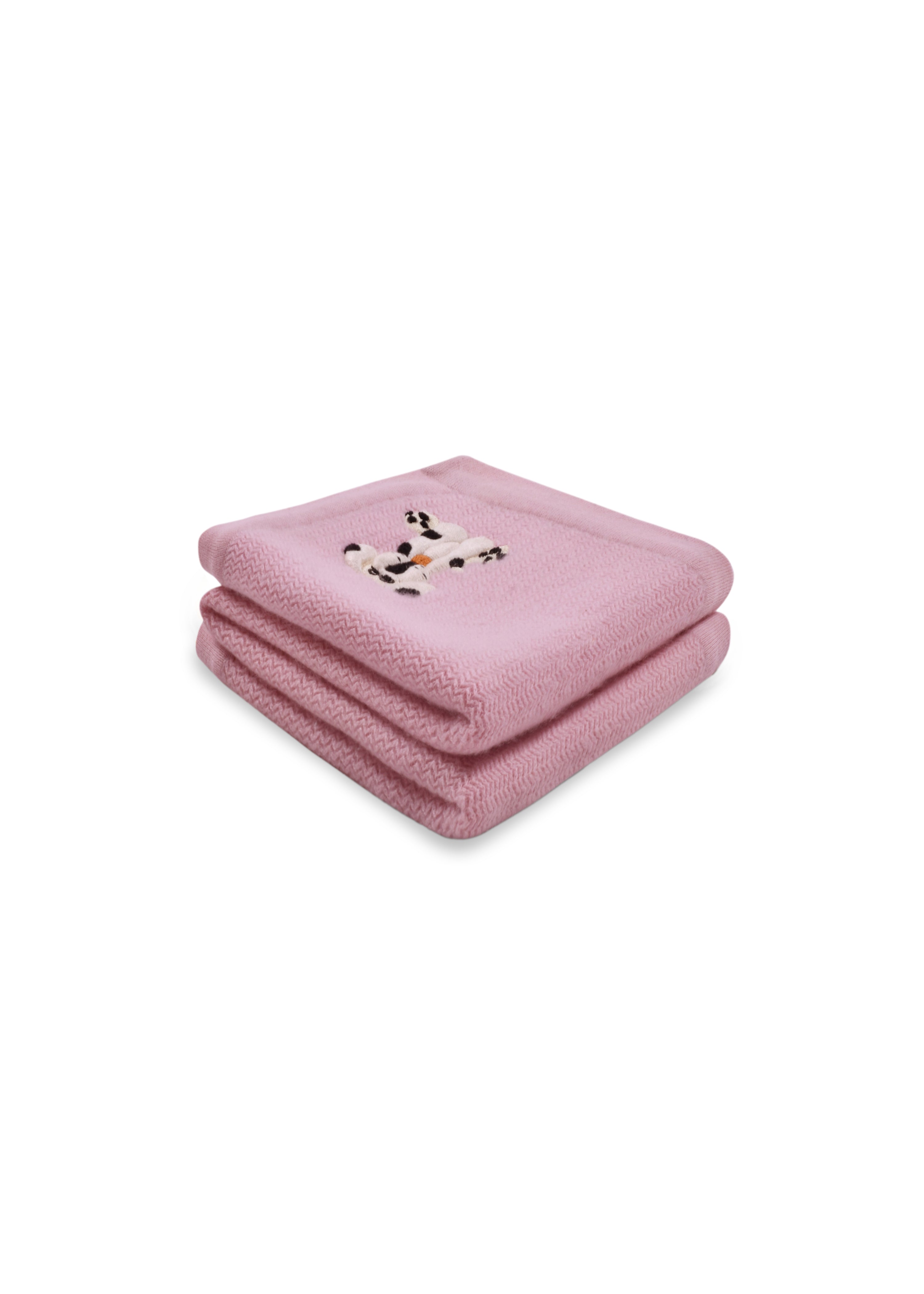 Soft and lightweight herringbone baby blanket woven in Cashmere – Merino blend, on a pink base with ivory cross stitch edging. An embroidered dog adds to the warmth of the throw.